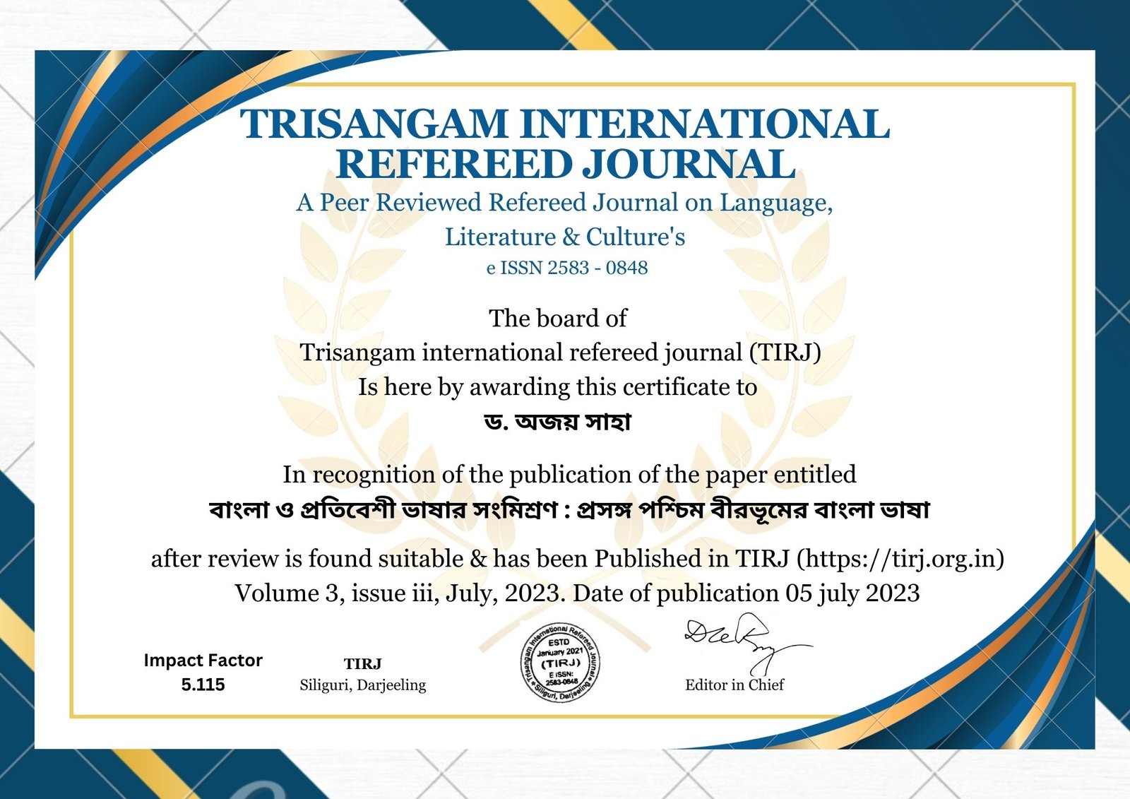 Title of The Paper – Bangla o pratibeshi bhashar songmishran : prasonga pashchim birbhumer bangla bhasha